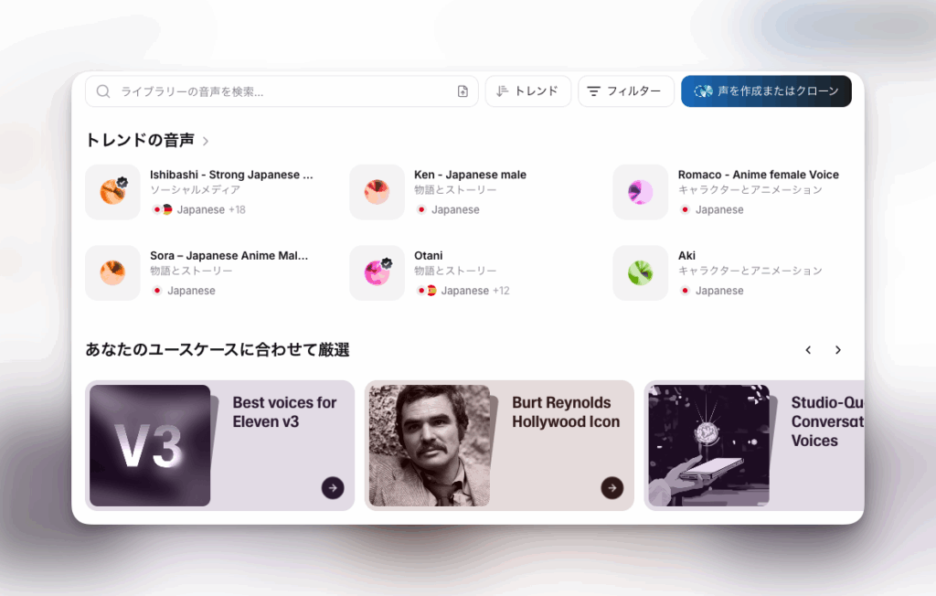 最新のAI音声モデル「Eleven v3」を搭載して、日本語を含む70以上の言語に対応しています[1]!