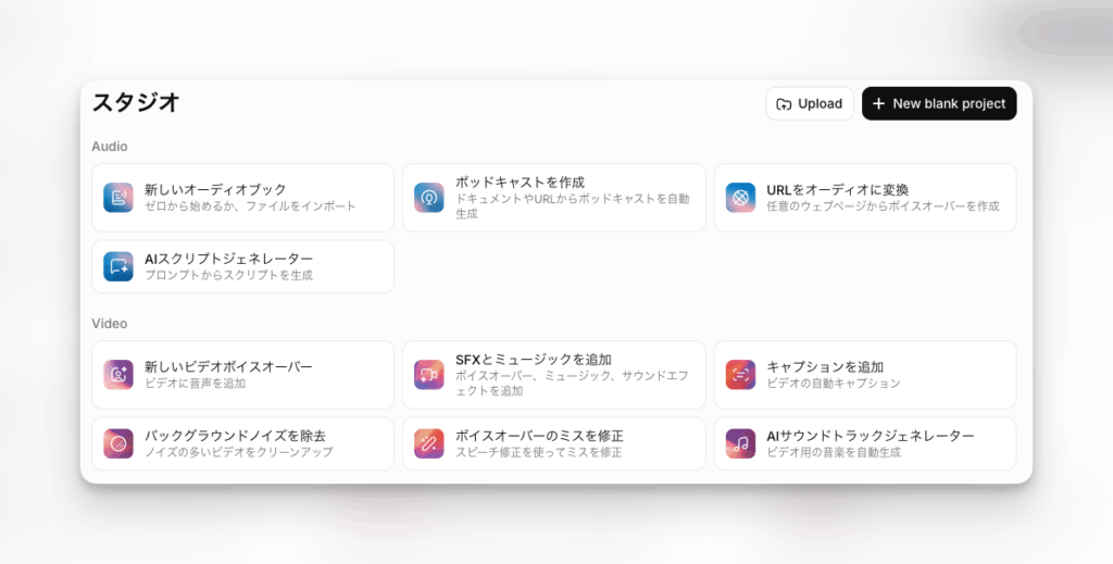 今回のリニューアルで何ができるようになったかというと、ボイスオーバー、音楽、効果音の生成、ノイズ除去、キャプション作成が全部一つの場所で完結するようになったんです[1]。
