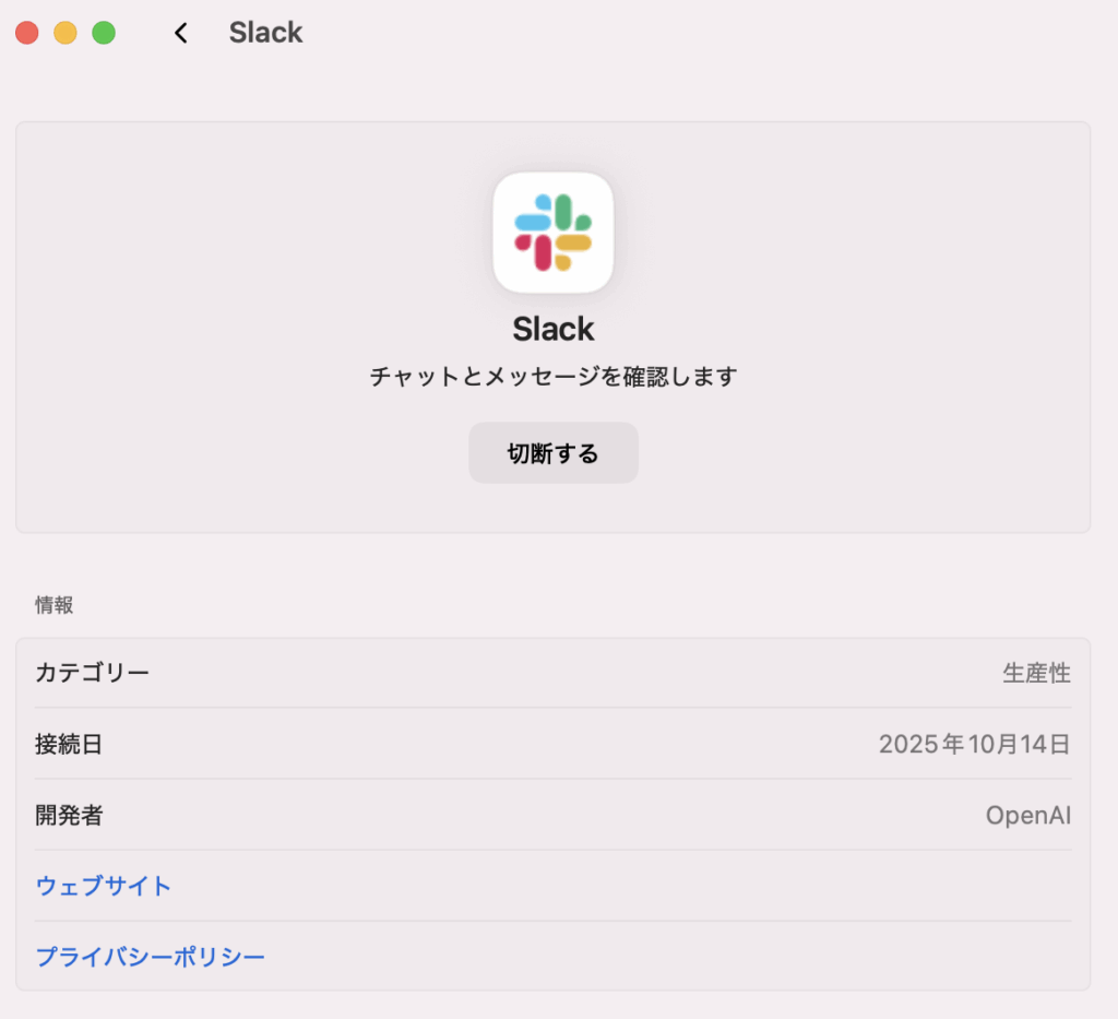 • ChatGPTの設定画面(Settings > Apps & Connectors)を開き、「Slack」の接続(Connect)を有効にする