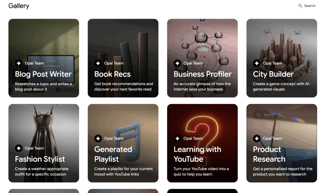 Google Opalの公式ギャラリーには、すぐに使える魅力的なテンプレートが豊富に用意されています。