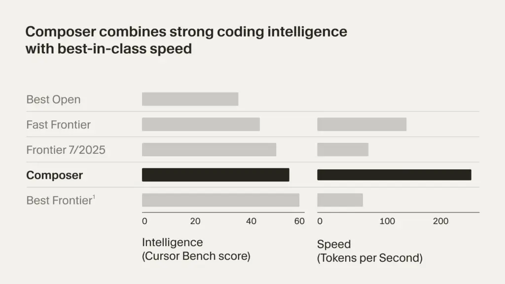 - Composer: Intelligence(約60点)とSpeed(約200トークン/秒)で圧倒的優位