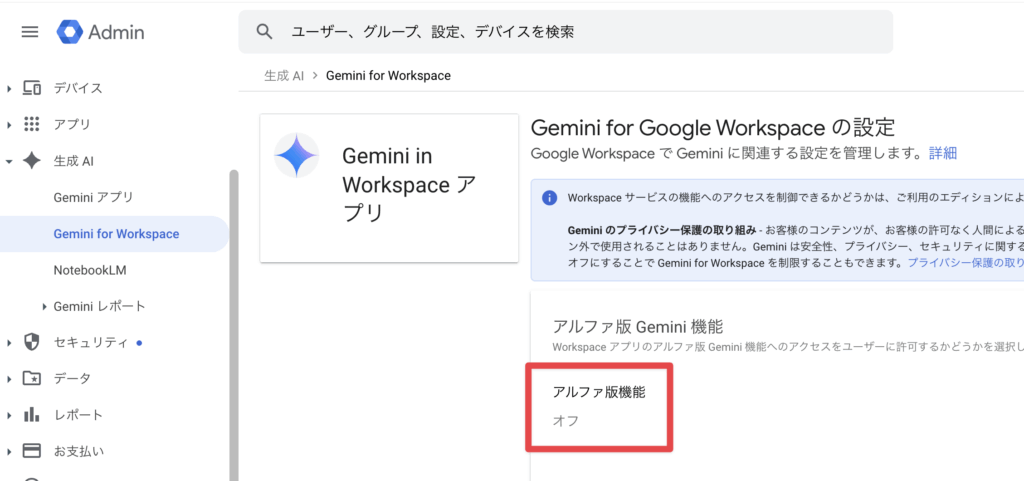 - 設定:管理コンソールでGeminiのアルファ機能を有効化