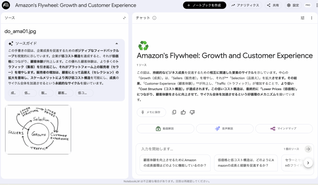 ベゾス(Amazon)の有名な手描きの成長ループ(フライホイール)を読み込んだ状態がこちらです。
